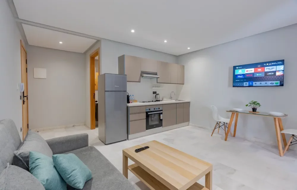 One of the reasons people choose this studio with balcony near Casablanca is the added outdoor space. The balcony allows fresh air to flow in and gives you a small place to sit with coffee. Guests often search for an affordable hotel room with balcony in Casablanca because natural light makes a big difference during longer stays.